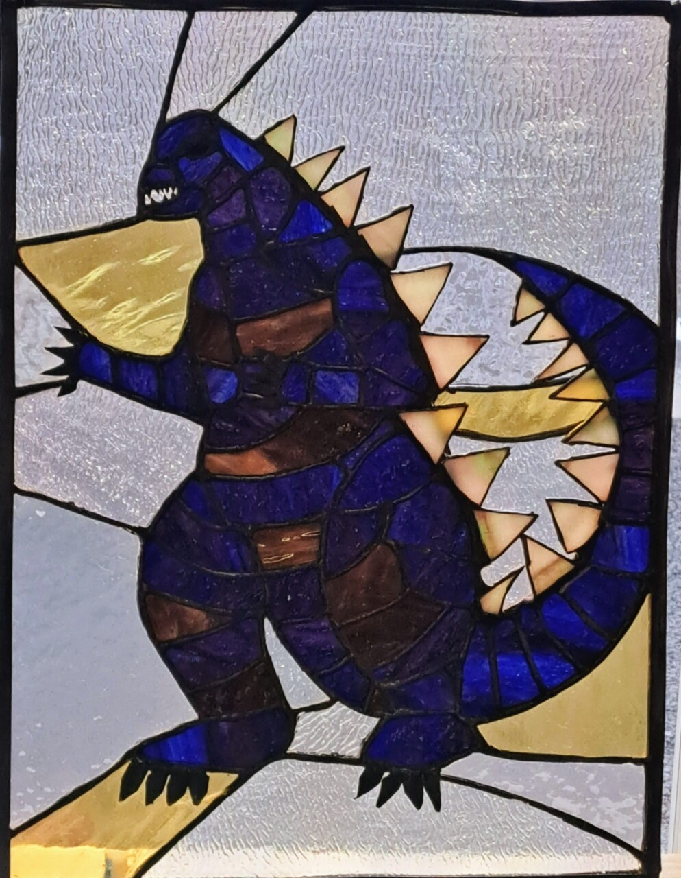- ガラスカット講習作品(注目カット)中心部分のロンデルの周りの丸抜きカット。4隅の,直角カット、長い曲線カット、アンティークガラスを使った配色。