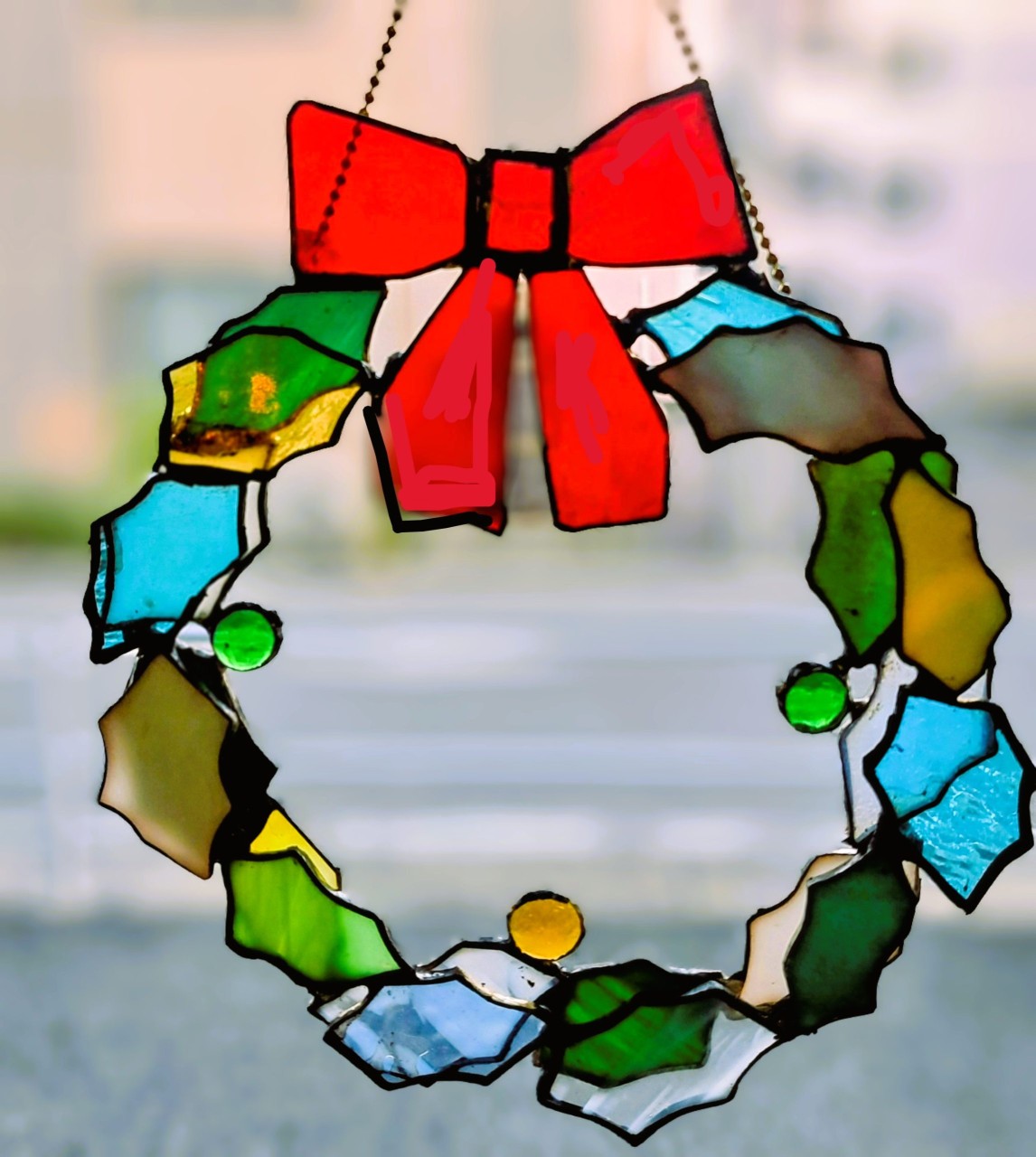 ステンドグラスのクリスマスリース作りの体験を企画しました。毎年クリスマスに飾れます。